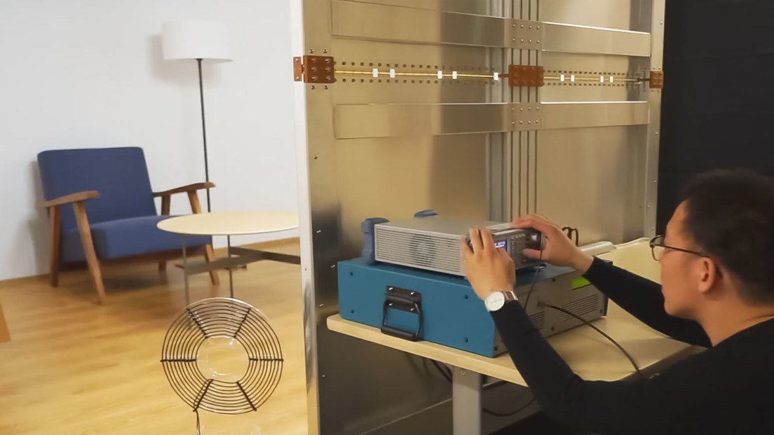 Los inventores muestran cómo funciona el método en una habitación de unos tres metros cuadrados y especialmente diseñada con aluminio escondido en sus paredes. Este cuarto se distingue por la ausencia de cableado, enchufes o puertos USB, alimentando lámparas, ventiladores y teléfonos que están presentes en el escenario y funcionan plenamente.