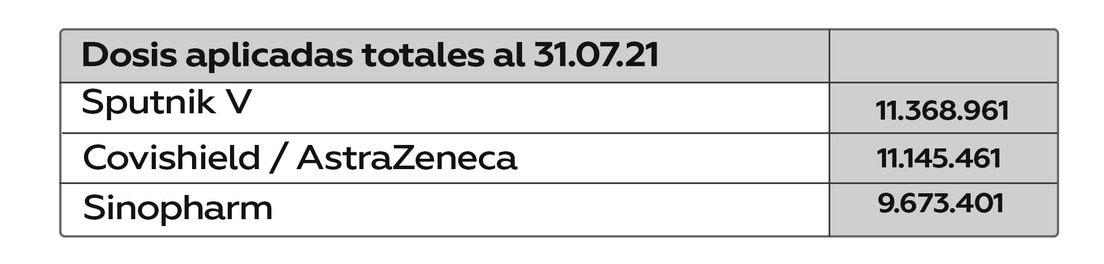 De acuerdo con el documento, se notificaron 2.999 ESAVI de las 11.145.461 vacunas aplicadas de AstraZeneca; entretanto, de Sinopharm fueron 2.384, de las 9.673.401 usadas; y de Sputnik V hubo 41.545 reacciones informadas de las 11.368.961 dosis que se aplicaron.