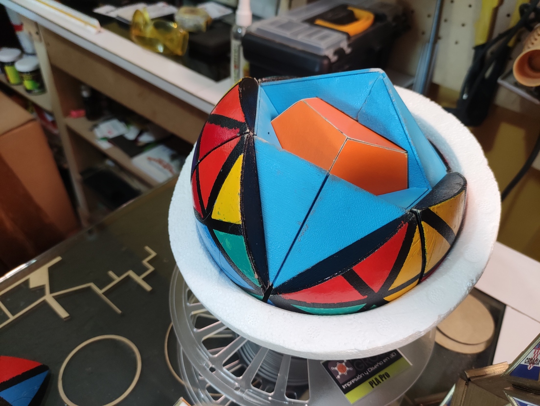 "Estos cinco sólidos platónicos están cortados en varias piezas y en total se forman 34 piezas. Entonces si nosotros vamos desarmando la esfera, van asomando otros volúmenes", señala.