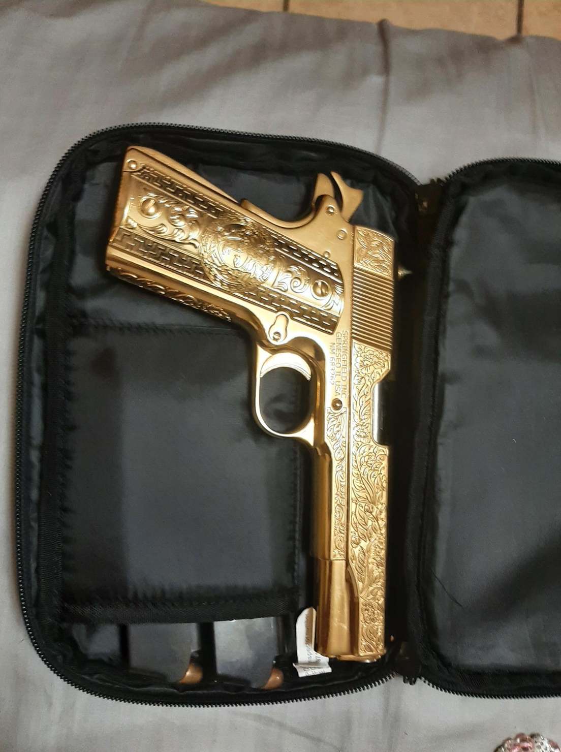Una investigación de seguimiento condujo al registro de dos residencias. En la primera, ubicada en Port Arthur, los oficiales confiscaron aproximadamente 44.000 en moneda estadounidense, un rifle y otro kilo de cocaína envuelto en plástico. Tras la búsqueda en la segunda residencia, ubicada en Bridge City, confiscaron una pistola chapada en oro decorada con hojas y otros diseños.