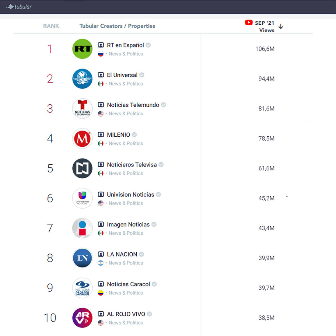 "El canal de YouTube RT en Español fue el medio de noticias y política hispanohablante más popular en términos de audiencia en YouTube en septiembre de 2021", según revelan los datos de Tubular, uno de los líderes mundiales en analítica de videos.