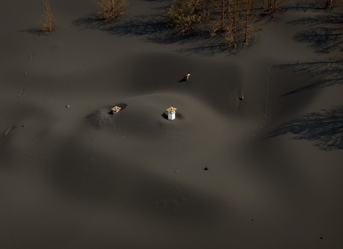 Parece una escena sacada de una película apocalíptica o de un videojuego. Las cenizas expelidas por el volcán Cumbre Vieja en la isla canaria de La Palma (España) han engullido casi por completo una casa, de la que apenas sobresalen partes del tejado de la densa capa de polvo.