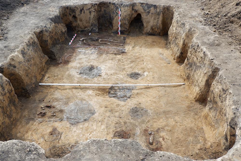Además de la placa, en el túmulo, que fue saqueado ya en la antigüedad, fueron hallados el esqueleto de un hombre, de entre 40 y 49 años, armas y elementos de tachuela de caballo escita, así como cerámica y la mandíbula inferior de un oso.
