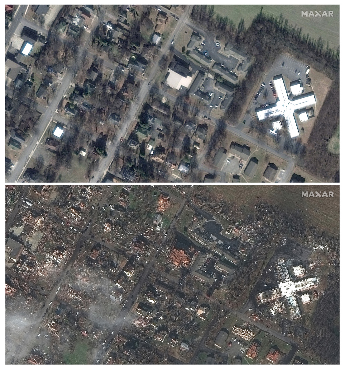 En imágenes satelitales compartidas por Maxar Technologies se puede ver el estado de la ciudad de Mayfield antes y después del paso de la tormenta. Las fotos muestran el devastador efecto de los tornados, uno de los cuales permaneció en el suelo a lo largo de más de 300 kilómetros. Numerosas viviendas, tiendas y una fábrica de velas (donde unas 110 personas estaban trabajando) resultaron destruidas, mientras que se registraron otros daños como árboles arrancados de raíz, líneas eléctricas caídas, carreteras bloqueadas y destrozos en vehículos.