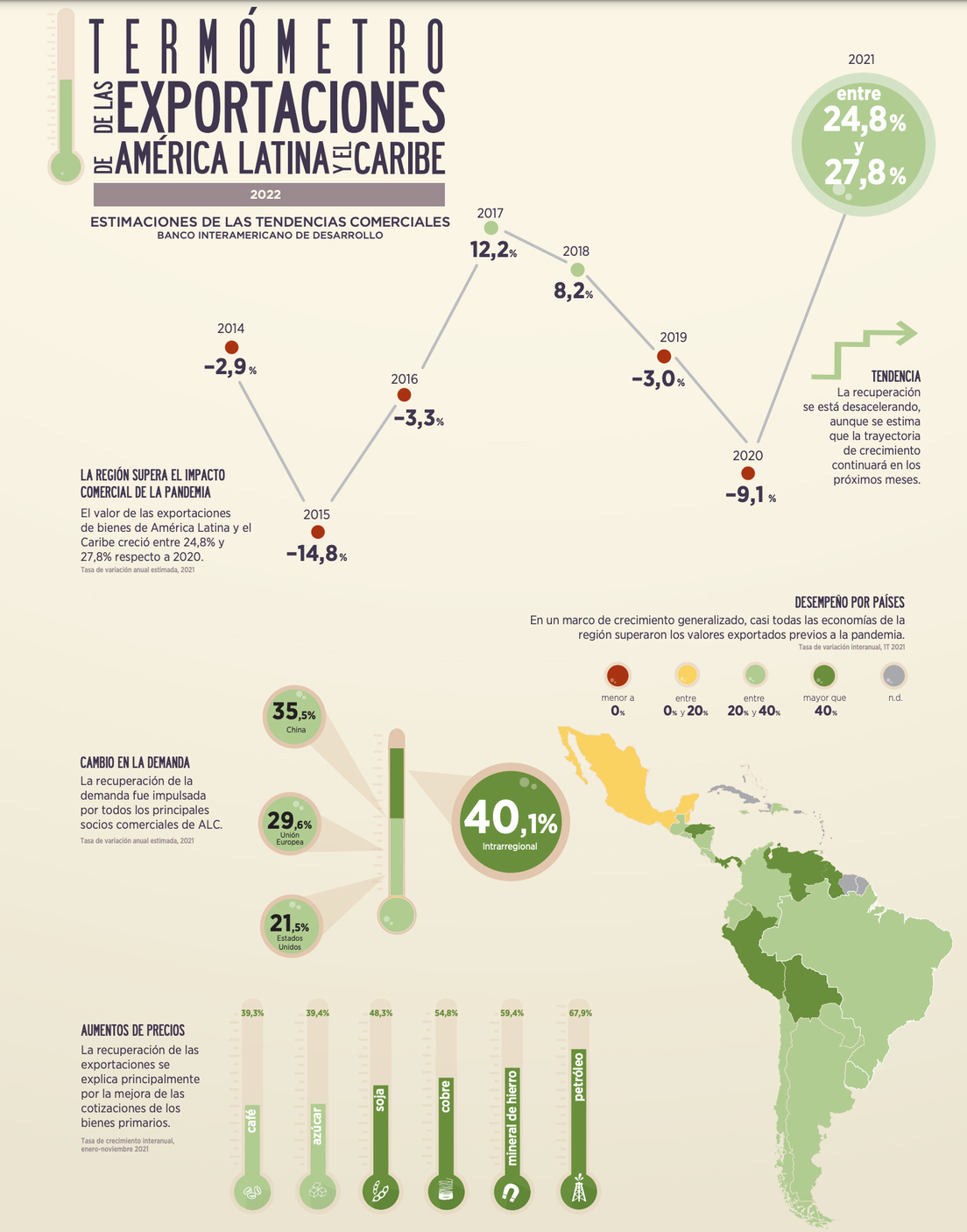 Esta subida se dio luego de sufrir una caída en el valor de las exportaciones de 9,1 % en 2020, señala el BID en su informe 'Estimaciones de las tendencias comerciales: América Latina y el Caribe - Edición 2022'.