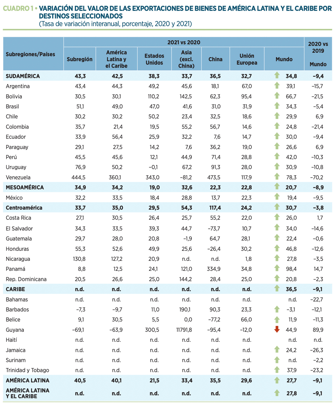 Concretamente sobre los volúmenes de las exportaciones de la región, en 2021 tuvieron un aumento estimado de 10,9 %, tras disminuir 6,1 % en 2020.