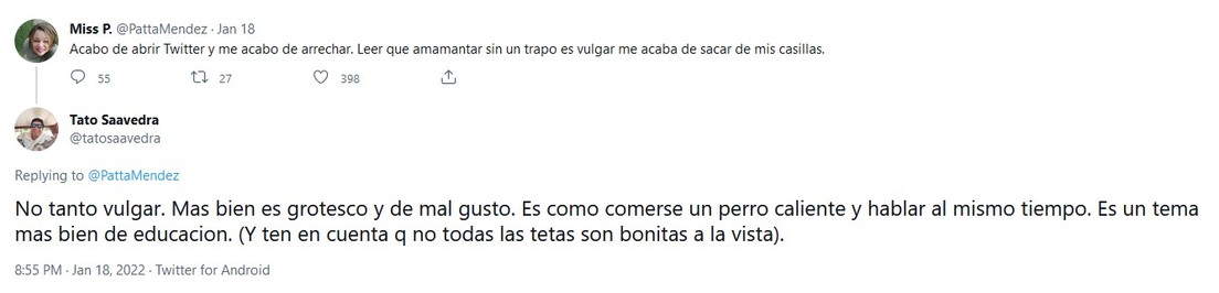"No tanto vulgar. Más bien es grotesco y de mal gusto. Es como comerse un perro caliente y hablar al mismo tiempo. Es un tema más bien de educación. (Y ten en cuenta que no todas las tetas son bonitas a la vista)", respondió Saavedra, lo que provocó una ola de repudio en esa red social.