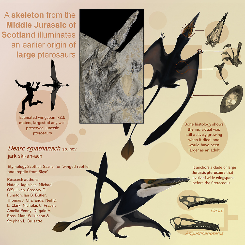 "Dearc es el mayor pterosaurio que conocemos del Jurásico, y eso nos dice que los pterosaurios se hicieron más grandes mucho antes de lo que pensábamos, mucho antes del Cretácico, cuando competían con las aves, y eso es enormemente significativo", comentó Steve Brusatte, coautor de la investigación, publicada este martes en Current Biology.