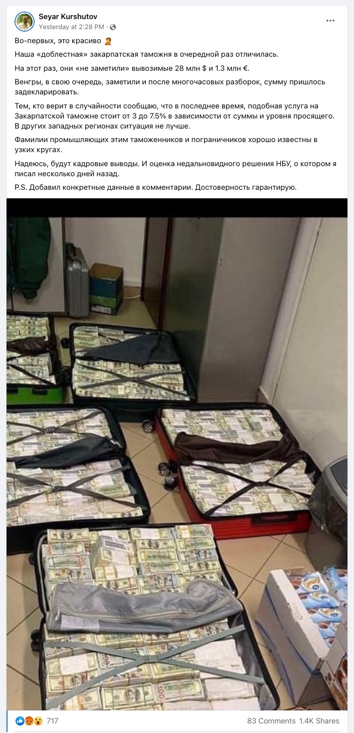 Por su parte, el diario Ukraínska Pravda confirma la información, citando a varias fuentes. Indica que, en relación con el caso, el Buró Estatal de Investigación (DBR, por sus siglas en ucraniano) recibió indicios de posibles violaciones de la ley por parte de una aduana de la provincia de Transcarpatia.