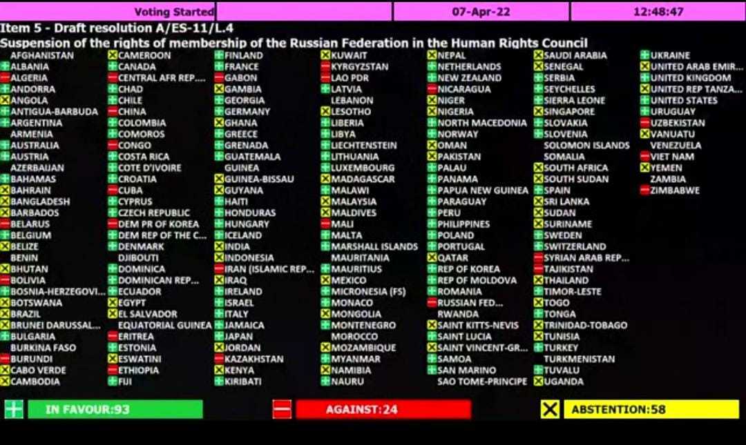 La Asamblea General de la ONU votó este jueves a favor de suspender a Rusia del Consejo de Derechos Humanos. El paso se da tras las acusaciones contra los militares rusos de matar a civiles en la ciudad ucraniana de Bucha, que fueron rechazadas repetidamente por Moscú.