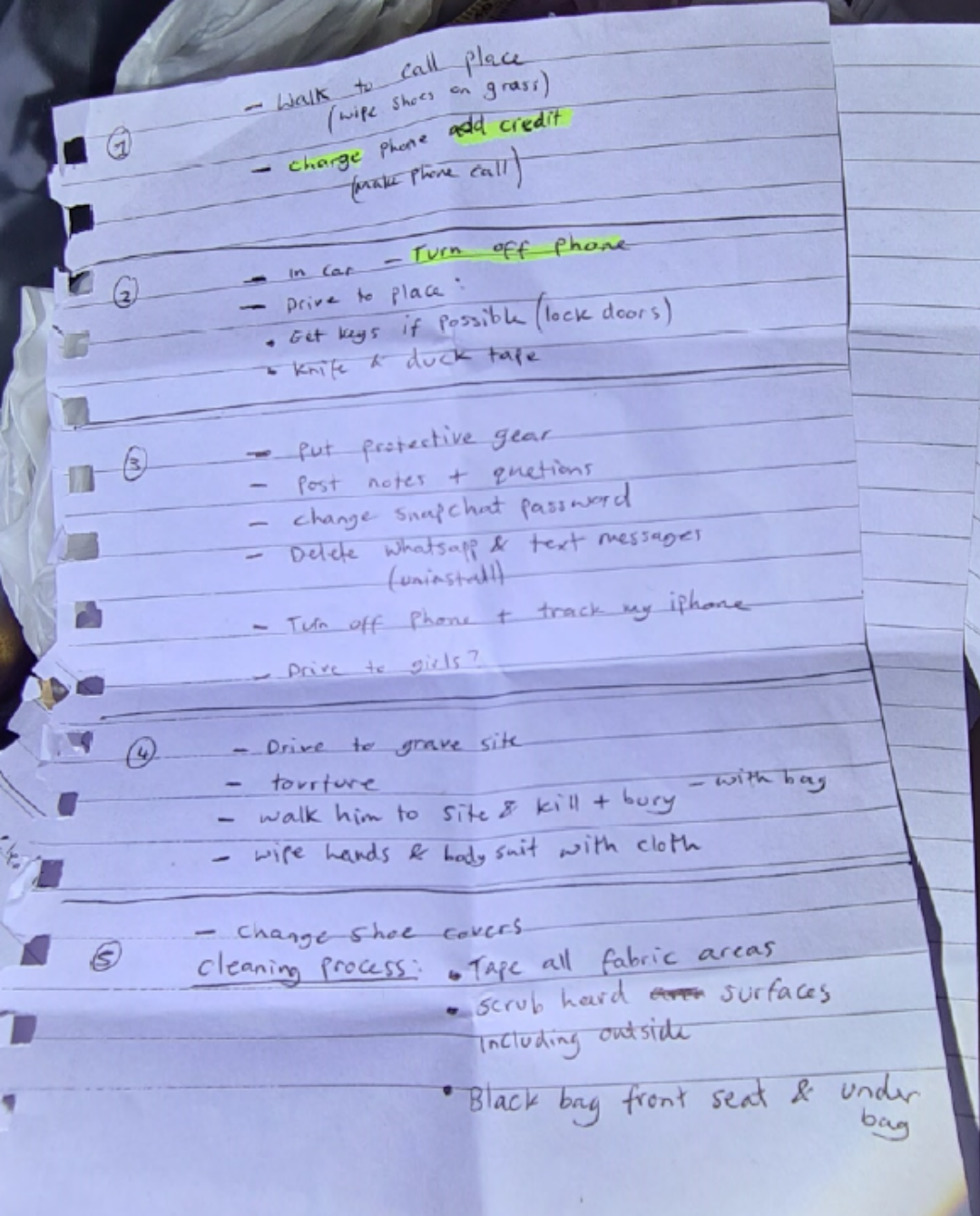 Durante el registro de su casa también se hallaron varias notas escritas en forma de 'listas de tareas', que incluían puntos como "llevarlo al lugar, matarlo y enterrarlo".