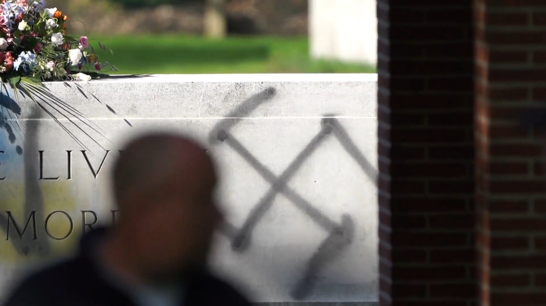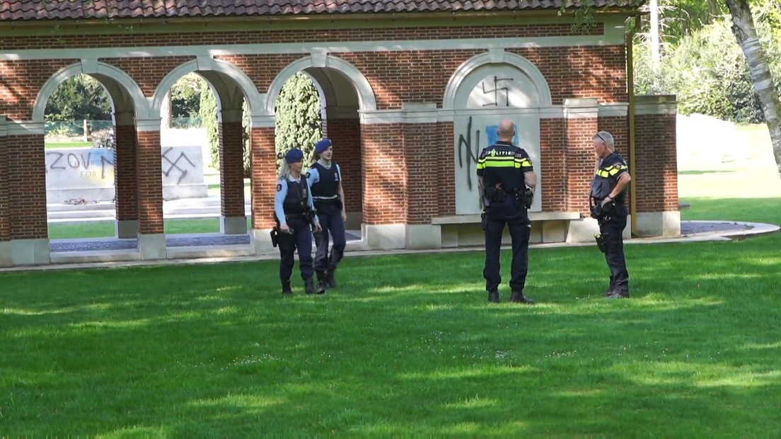 En varias imágenes se puede observar cómo los atacantes pintarrajearon paredes y lápidas del cementerio y memorial de guerra Jonkerbos con banderas ucranianas, mensajes antirrusos y símbolos nazis, incluyendo la esvástica y el wolfsangel, insignia de las SS y ahora del regimiento nacionalista ucraniano Azov.