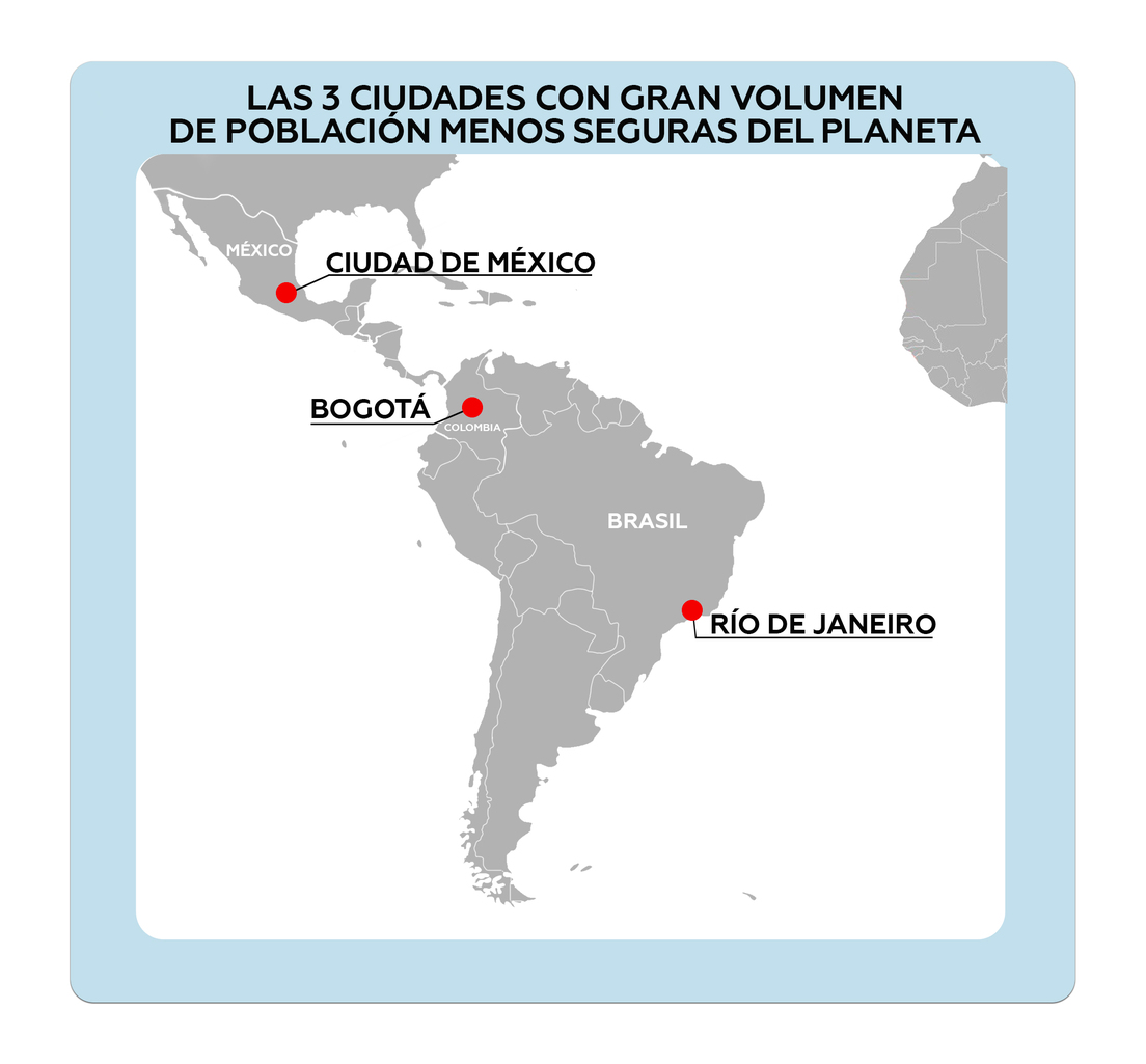 El estudio señala que, al observar las 30 ciudades más grandes del mundo por volumen de población, se concluyó que las tres urbes más peligrosas están también en América Latina: Río de Janeiro, Bogotá y Ciudad de México.