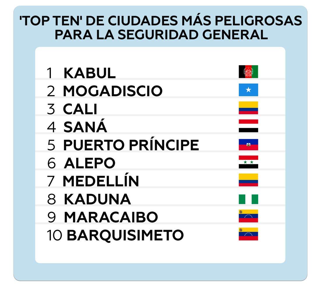 Asimismo, Verisk Maplecroft destaca que Kabul (Afganistán) es la peor ciudad para la seguridad general, seguida por Mogadiscio (Somalia), Cali (Colombia), Saná (Yemen), Puerto Príncipe (Haití), Alepo (Siria), Medellín (Colombia), Kaduna (Nigeria) y las urbes venezolanas de Maracaibo y Barquisimeto.