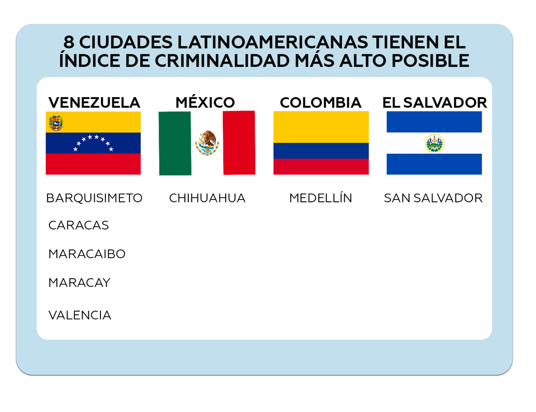 De hecho, Latinoamérica alberga 8 de las 12 ciudades que reciben la puntuación más alta de riesgo: Barquisimeto, Caracas, Maracaibo, Maracay y Valencia, en Venezuela; Chihuahua, en México; Medellín, en Colombia; y San Salvador, la capital de El Salvador.