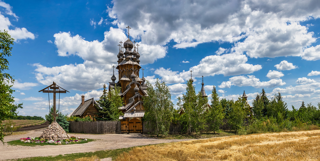 La iglesia de madera de Todos los Santos de la Tierra Rusa en Sviatogorsk fue construida en 2009 siguiendo la tradición de la arquitectura de madera rusa de los siglos XVI-XVII, en el lugar donde se erigía una iglesia más antigua, volada en 1947.