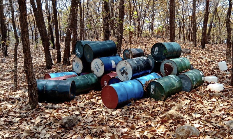 De acuerdo a las autoridades, en el exterior de la edificación improvisada fueron hallados "45 tambos metálicos, con una capacidad de 200 litros, sin contenido, así como 49 bidones de plástico para 50 litros, de los cuales tres tenían algún tipo de precursor químico".