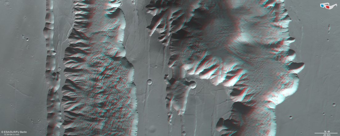 Las imágenes, tomadas por la cámara estéreo de alta resolución del Mars Express durante su órbita 23.123 alrededor de Marte, muestran dos trincheras que forman parte del Valles Marineris occidental. Se trata de Ius Chasma, de 840 kilómetros de largo, y de Tithonium Chasma, de 805 kilómetros de largo, que alcanzan una profundidad de hasta 7 km.
