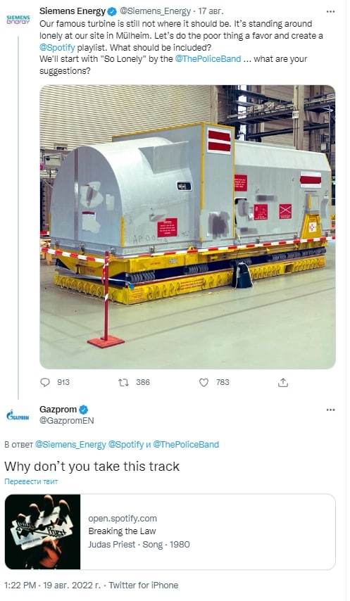 Por su parte, el gigante gasístico ruso Gazprom, que ha afirmado en repetidas ocasiones que la turbina quedó bloqueada por el incumplimiento de un contrato existente, respondió al tuit de Siemens y propuso añadir la canción 'Breaking The Law' ('Violando La Ley', en español) de la banda Judas Priest.