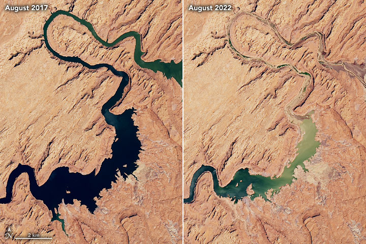 La NASA ha publicado este miércoles imágenes satelitales que evidencian la pérdida histórica de agua del segundo embalse más grande de Estados Unidos, el lago Powell, ubicado a ambos lados de la frontera entre Utah y Arizona.