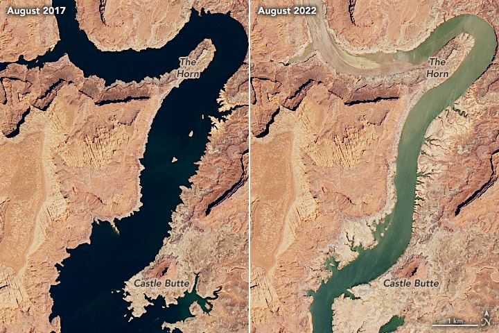 Actualmente, luego de 3 años de sequía extrema y más de 2 décadas de escasez de lluvia en la región, se encuentra en sus niveles más bajos, un 26% de su capacidad, desde que se llenó a mediados de la década de 1960. Las instantáneas muestran partes del lago en los meses de agosto del 2017, cuando se encontraba en sus niveles más altos de la última década, 1.107 metros, y recientemente en el 2022, con 1.077 metros.