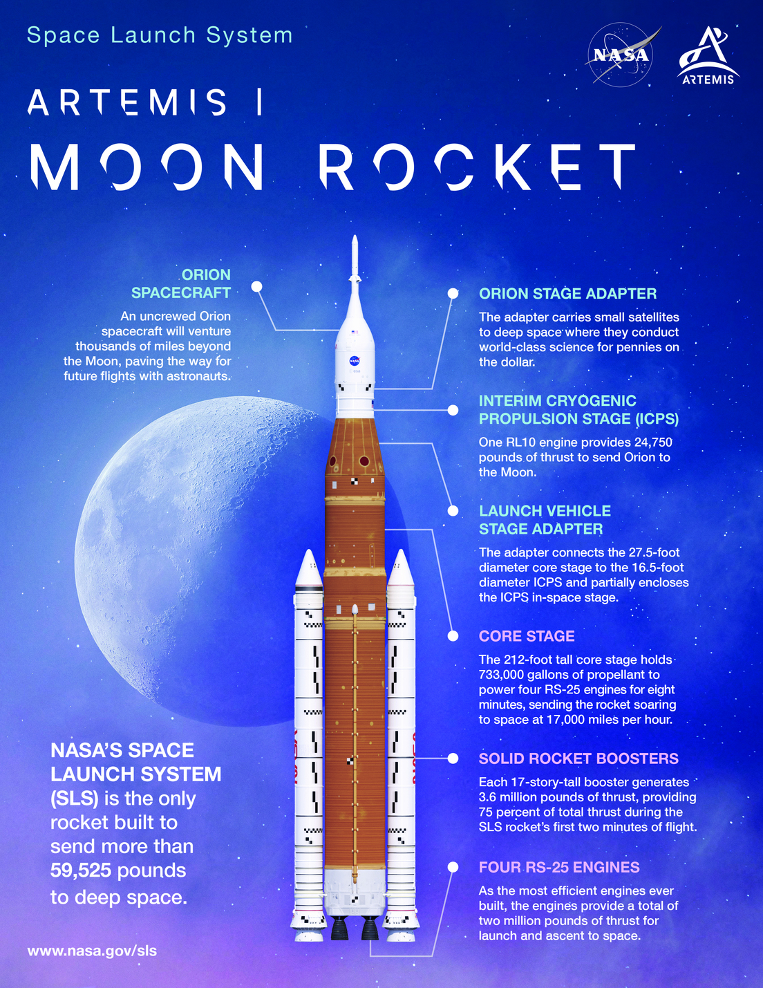 Según detalla la institución, cada uno de los dos principales propulsores del SLS generará una fuerza de empuje de 1,6 millones de toneladas. El cohete tiene la capacidad de poner en órbita una carga de hasta 25.000 kilos, una particularidad que lo convierte en el más potente hasta ahora construido por la NASA.