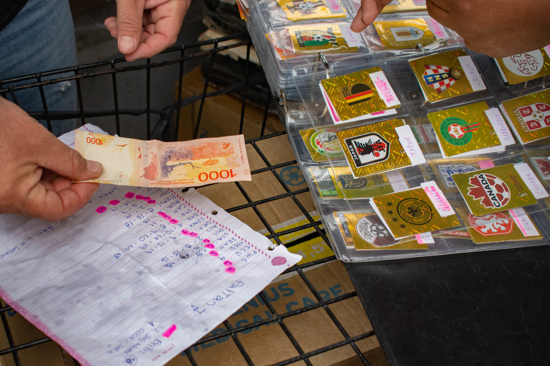 Los cromos de Catar 2022 también se venden por unidad y 'a la carta'. Aquí en el Parque Rivadavia, meca del coleccionismo porteño, una señora exhibe las figuritas en unas prolijas carpetas con folios transparentes, una página por equipo. Ofrece cada una a 50 pesos, los escudos a 200, y a Lionel Messi lo vende por 3.000 pesos (casi 20 dólares).