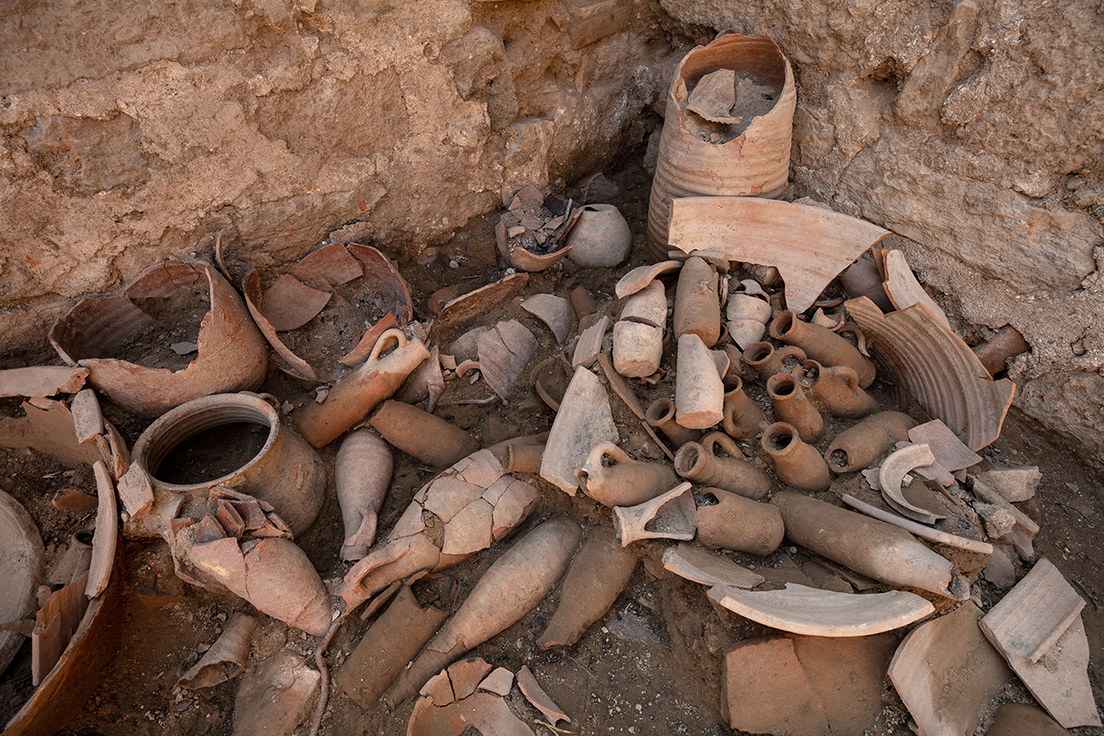 Los investigadores encontraron allí una gran cantidad de platos, entre ellos cuencos enteros con restos de marisco, como berberechos u ostras, así como ánforas llenas de caballa salada. Además, se recuperaron huesos de melocotones y aceitunas, guisantes carbonizados y almendras.