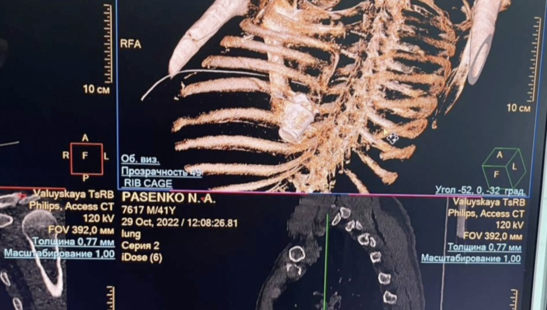 La munición, proveniente de las fuerzas ucranianas, perforó las costillas del sargento Nikolái Pasenko, los pulmones y se detuvo en la columna vertebral entre la aorta y la vena cava inferior, cerca del corazón.