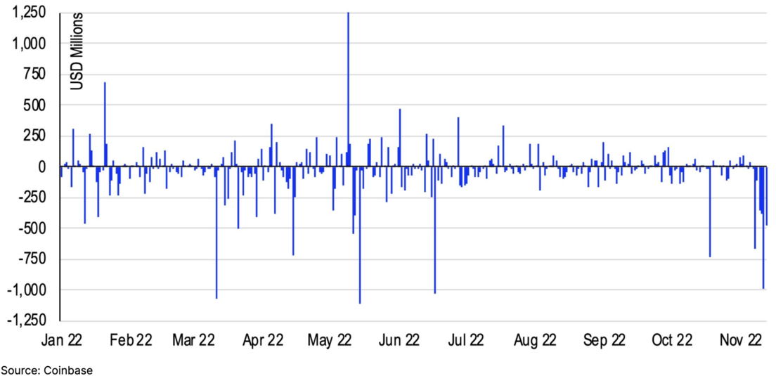 Mientras tanto, la importante cantidad de bitcoines que actualmente se retira de los intercambios ha situado la volatilidad en el 66 %. En comparación, la volatilidad a finales de junio, después de Celsius/3AC, fue del 77 %, pese a que su trayectoria fue mucho menos pronunciada que la que se registró entre el 6 y el 10 de noviembre.