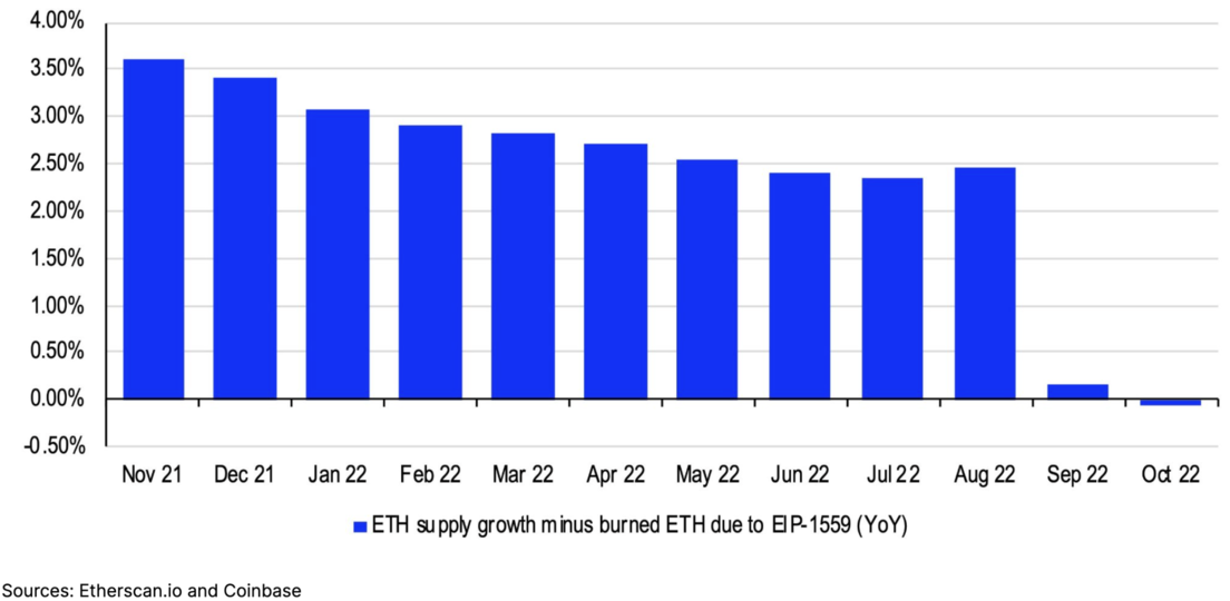 La criptomoneda Ether registró su primer mes deflacionario debido a que a mediados de octubre tuvo un aumento de la actividad asociada con XEN Crypto, un proyecto de 'token' basado en ETH. En concreto, se generó un aumento masivo en el tráfico de la red concentrado entre el 8 y el 26 de octubre que provocó que aumentara la tasa de consumo de ETH. Las cifras revelan que en octubre se quemó un promedio diario de 1.875 ETH, dejando a ETH con una tasa de crecimiento de oferta anualizada negativa del -0,07 %.