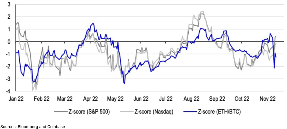 Tras analizar la situación, los expertos llegaron a la conclusión de que es poco probable que los factores técnicos de apoyo ayuden mucho a cualquier activo digital frente a las consecuencias en FTX. Como muestra de ello, recordaron el fuerte retroceso que se registró a principios de noviembre en el cruce ETH/BTC, calificado como "un barómetro del sentimiento de riesgo criptográfico de los inversores". Ya entonces se pudo ver una reducción de la exposición al riesgo que los inversores optaron por tomar en octubre.