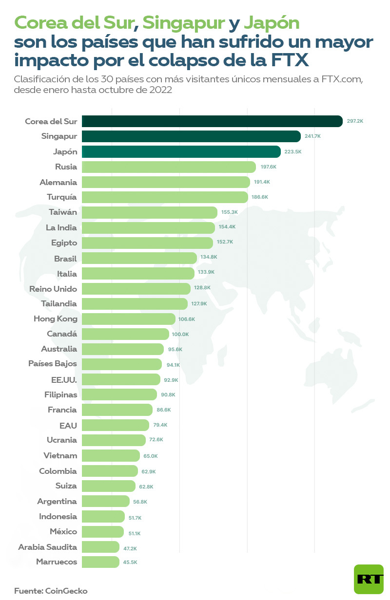 Corea del Sur, Singapur y Japón son los tres países más afectados por el colapso de la bolsa de criptoactivos FTX de acuerdo con los datos que presenta una investigación del portal Coingecko, realizada en base a la cantidad de visitantes únicos mensuales y la cuota de tráfico por nación entre enero y octubre de 2022.