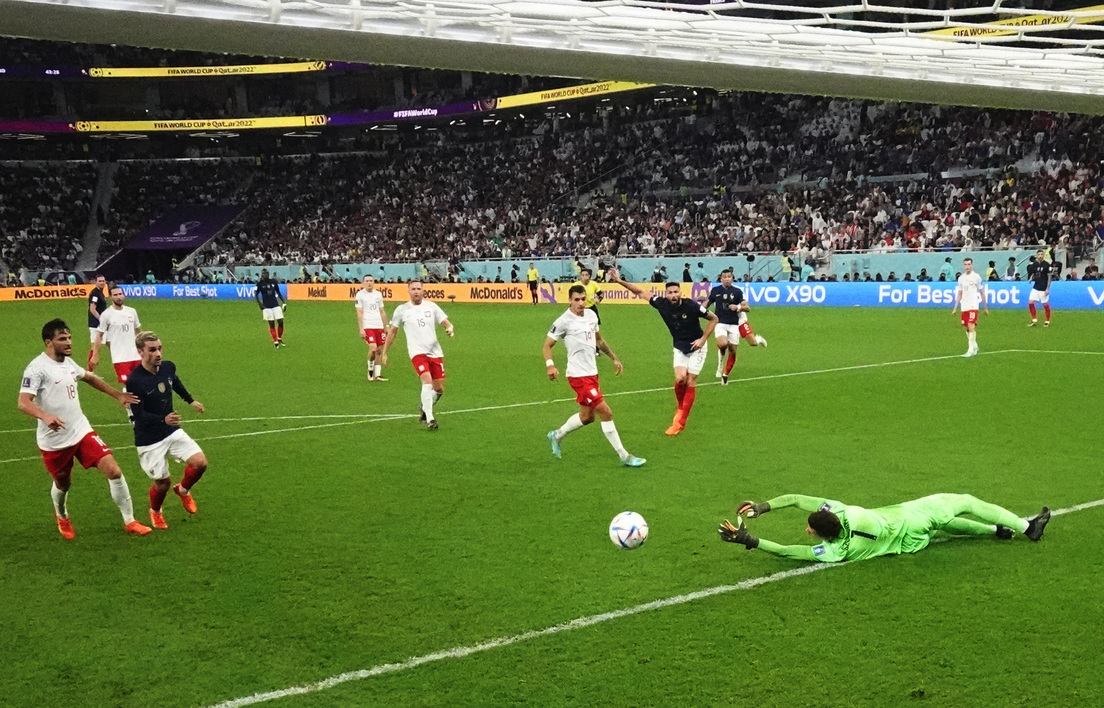 A los 58 minutos del segundo tiempo el árbitro le anuló un golazo de chilena a Giroud por una falta de su compañero Raphaël Varane sobre el portero polaco, Wojciech Szczesny. No obstante, los últimos campeones del mundo se tomaron revancha y a los 74' Mbappé disparó un potente remate a la portería polaca para marcar el segundo gol francés.