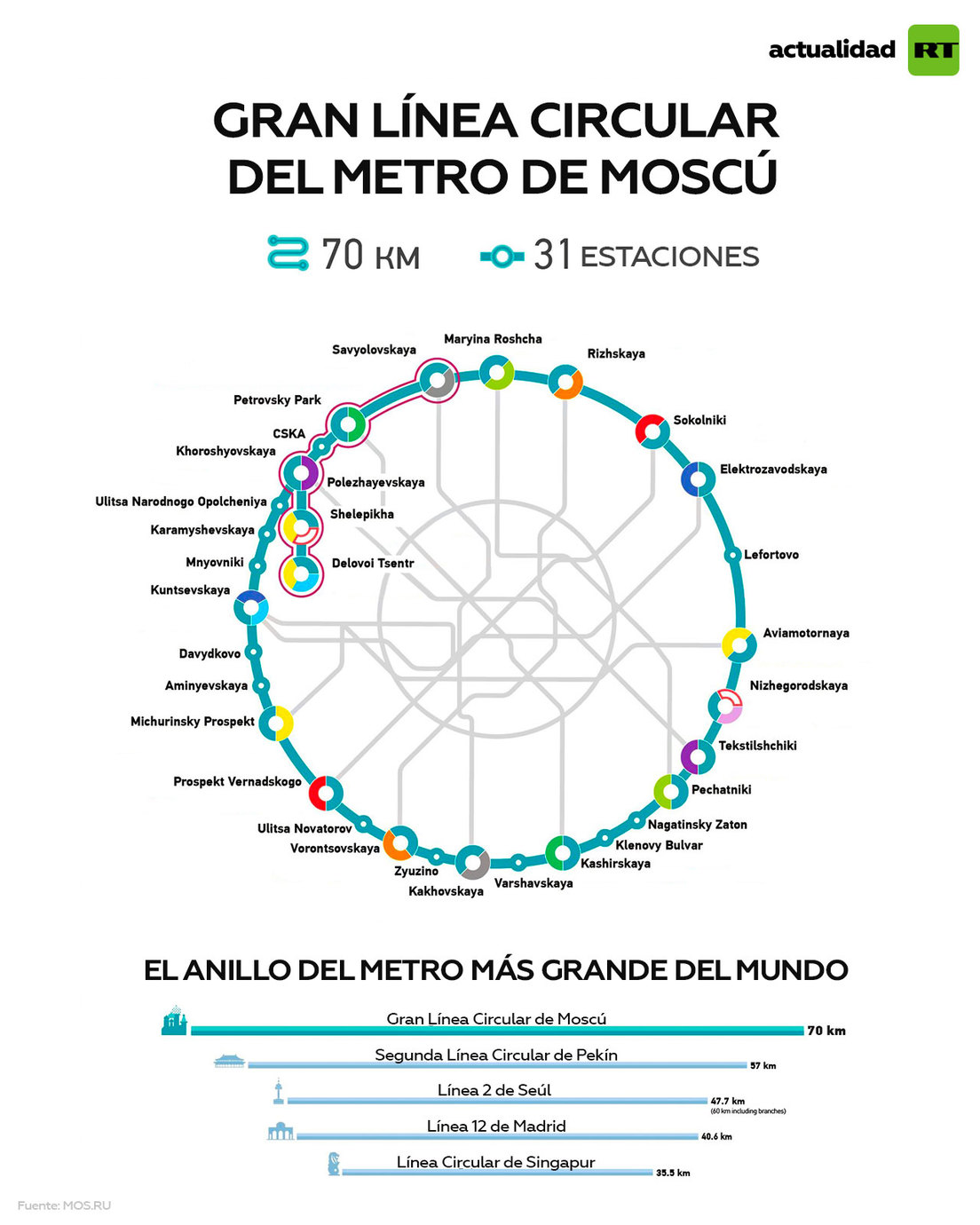 De 70 kilómetros de longitud, la nueva línea circular del metro moscovita abarca 31 estaciones, convirtiéndose en la más extensa del mundo y dejando en segundo lugar otro famoso anillo, la línea 2 del metro de Pekín, de 57 kilómetros.