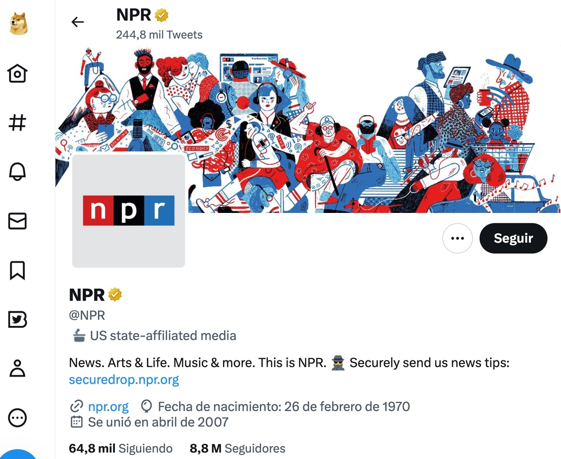 Este martes, Twitter le ha colocado a la radiodifusora estadounidense NPR la leyenda "medio afiliado al Gobierno de EE.UU.", según se puede ver en la cuenta del medio en esta red de microblog.