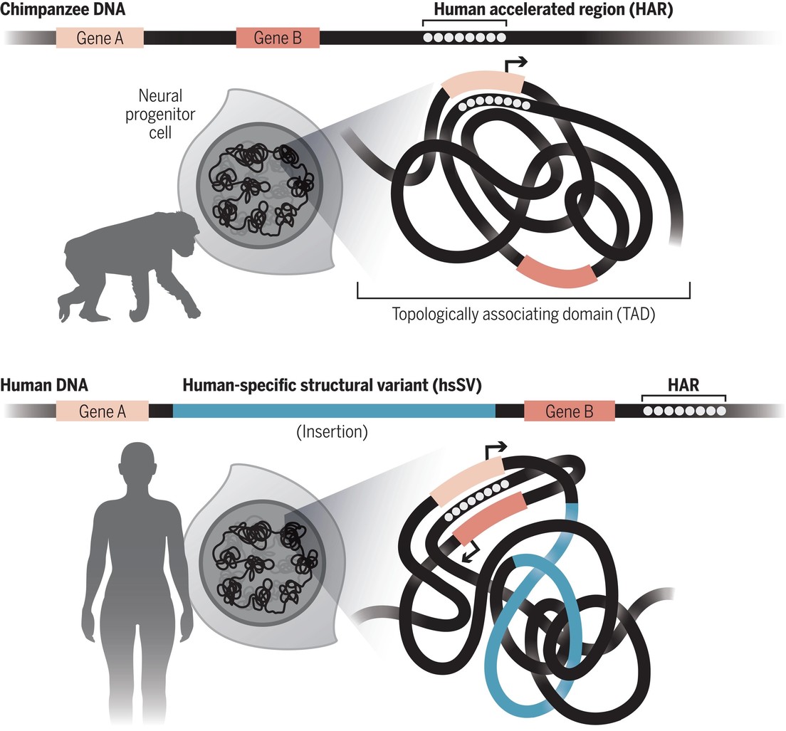 Con un modelo de aprendizaje automático para comparar secuencias de ADN e identificar regiones del genoma que se pliegan de manera diferente predijeron que, casi el 30% de las HAR estaban en áreas del genoma que se plegaban de manera diferente en humanos en comparación con los chimpancés. Este plegamiento diferencial en los humanos trajo diferentes genes cerca de las HAR, que pudieron tener consecuencias drásticas para nuestros antepasados. El nuevo hallazgo fue publicado la semana pasada en la revista Science.