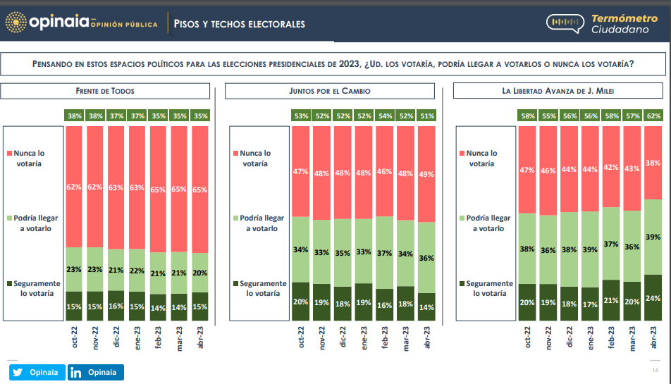 Detrás queda el oficialista Frente de Todos (FdT), con 35 % de apoyo y un 65 % de gente que "nunca lo votaría".