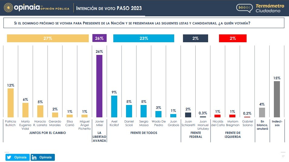 La primera consulta no tiene en cuenta la definición que se dará en las elecciones Primarias, Abiertas, Simultáneas y Obligatorias (PASO) del 13 de agosto, en la que cada fuerza medirá a sus posibles candidatos, salvo LLA que ya tiene definido al suyo.