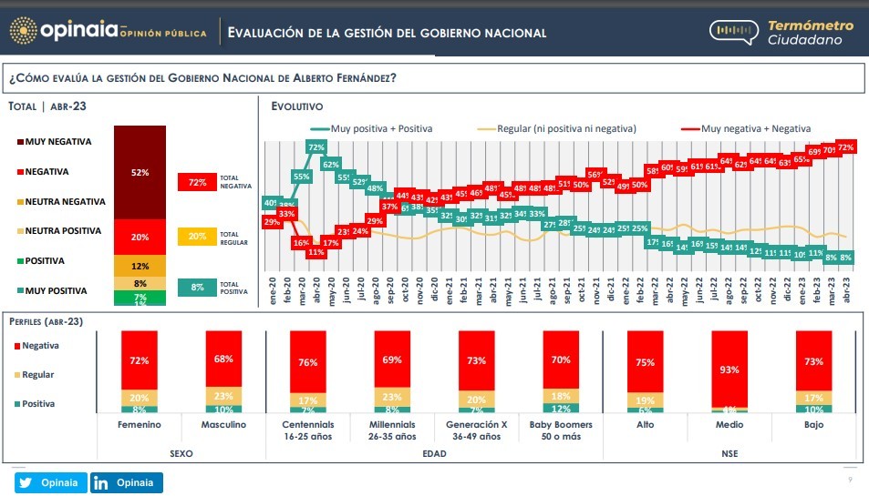 La evaluación del Gobierno Nacional alcanza su nivel más crítico. El 72 % de los consultados juzga negativamente la administración peronista, y esta valoración es compartida por los distintos segmentos sociodemográficos según sexo, edad y nivel socioeconómico.