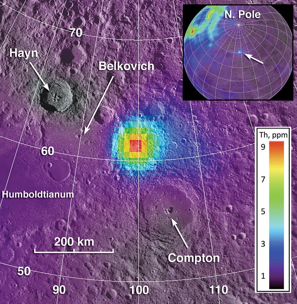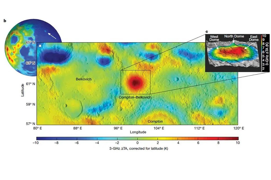 Los datos recopilados mostraron un alto gradiente geotérmico que coincide exactamente con una gran superficie rica en silicio de 20 km de ancho que los científicos consideran que se trata de una caldera volcánica extinta situada entre los cráteres Compton y Belkovich. La zona tiene una temperatura que es alrededor de 10 grados Celcius más cálida que su entorno.
