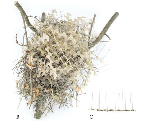 Este mismo principio ha sido adaptado para prevenir que las aves descansen o aniden en ciertos espacios, por lo que se ha desarrollado una gran variedad de pinchos antipájaros y redes antianidamiento. No obstante, estos dispositivos no siempre cumplen con su función e incluso son aprovechados por algunas especies para construir su nido.
