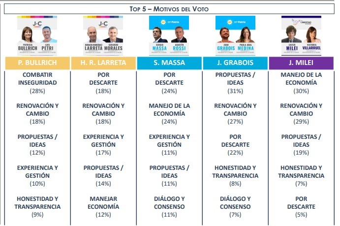 Dentro de la interna de Unión por la Patria, el ministro Massa se impone por su capacidad para manejar la economía (24 %), su experiencia de gestión (11 %) y su capacidad de diálogo (11 %). Al votante de Grabois, en tanto, lo eligen por 3 motivos: sus ideas y propuestas (31 %), representar una renovación en la política (27 %), y su honestidad y transparencia (8 %).