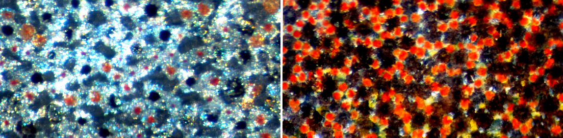 De esta manera, notaron que la piel de un pez perro parece una pintura puntillista. Cada punto de color es una célula llamada cromatóforo que contiene gránulos de pigmento que pueden ser rojos, amarillos o negros.