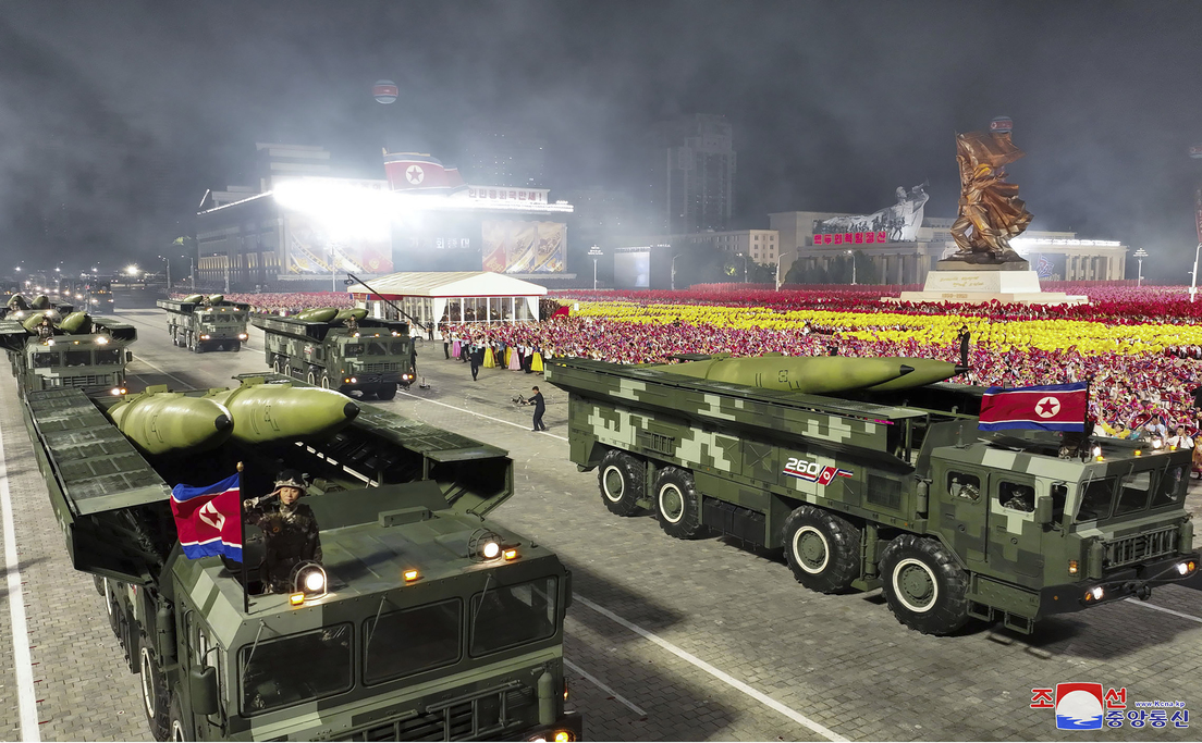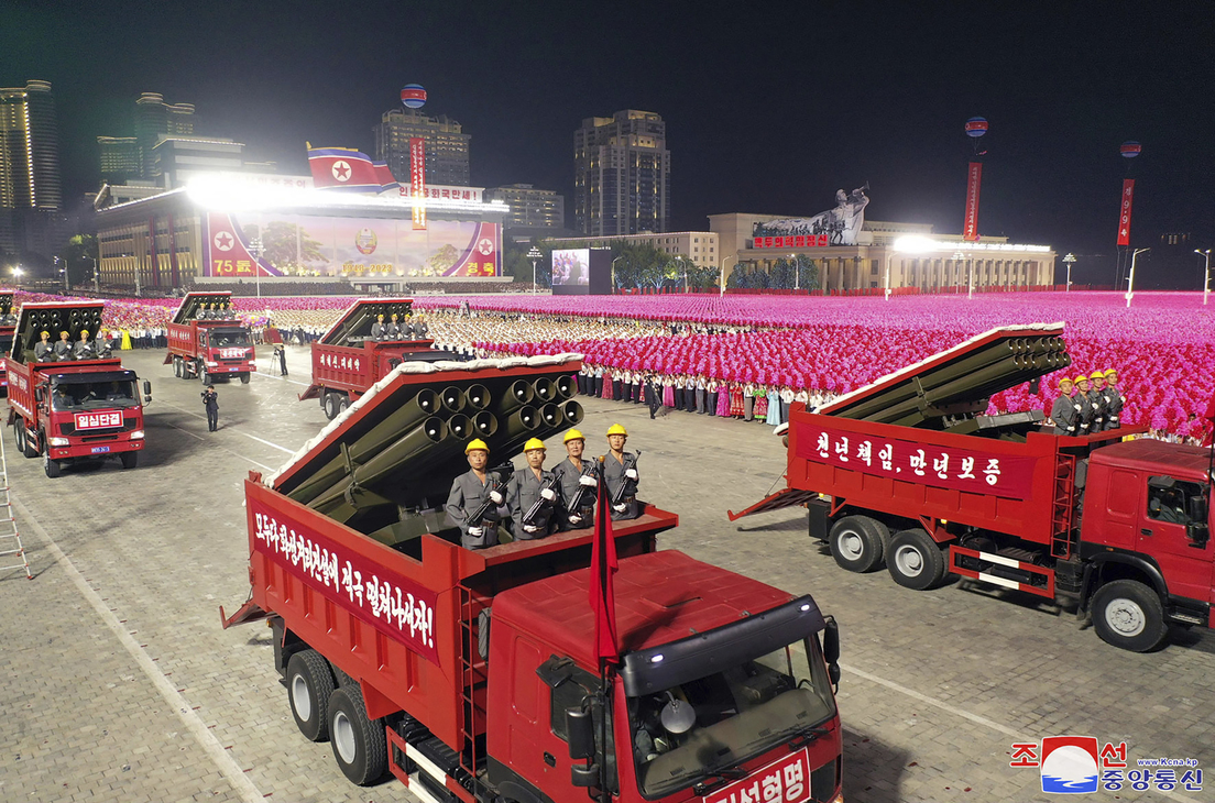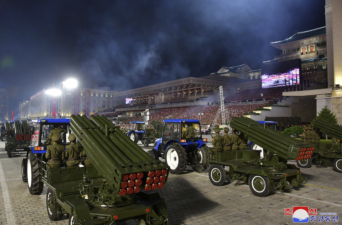 "Las columnas de motocicletas de gran movilidad, los lanzadores de misiles antitanques arrastrados por tractores que desempeñan un papel protagonista en la mecanización del trabajo agrícola en el campo socialista, las piezas de artillería antiaérea que construyeron muros protectores de hierro en el cielo sobre cada pueblo y lugar de trabajo, y los múltiples lanzacohetes camuflados [...], pasaron rugiendo por la plaza con total disposición para asestar golpes despiadados a los agresores", indica la agencia.