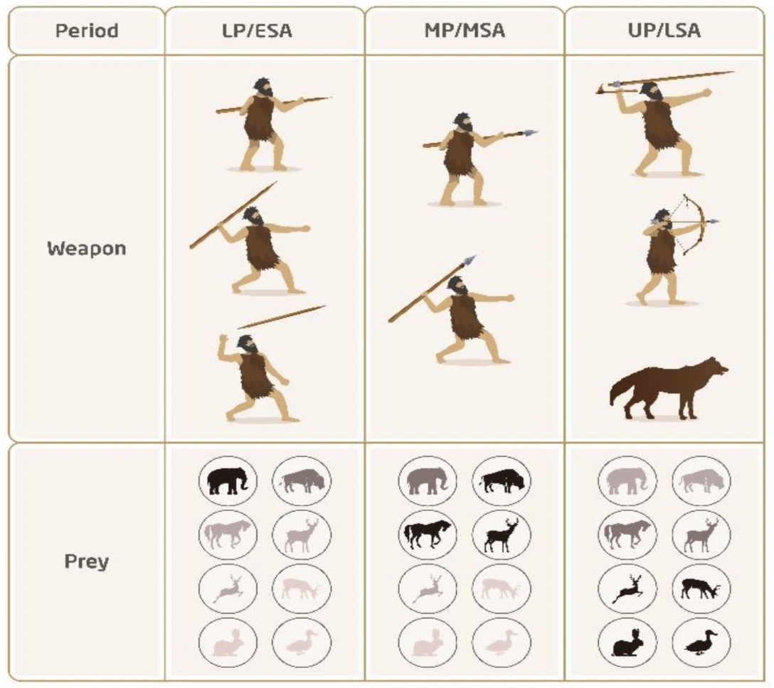 Según los científicos, hace unos 500.000 años, los humanos utilizaban lanzas de madera como herramienta para cazar grandes animales. Sin embargo, tras la extinción de muchas presas de gran tamaño, los humanos antiguos tuvieron que cazar animales más rápidos y ágiles que resultaban más difíciles de matar, y fue durante este periodo cuando se inventó la lanza con punta de piedra. Después se empezaron a inventar armas de diseño mecánico más precisas, como arcos y puntas de lanza.