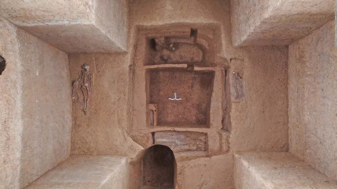 En la cámara funeraria principal, los arqueólogos descubrieron dos ataúdes de madera con ricas decoraciones con motivos intrincados, así como dos nichos con varias vasijas de porcelana, que contenían granos, líquidos o aceites.