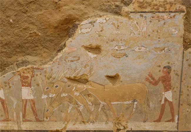 Las delicadas pinturas de la mastaba representan escenas de la vida cotidiana, incluidos burros trillando granos, barcos navegando por el Nilo y mercados bulliciosos, junto con representaciones de asistentes haciendo ofrendas.