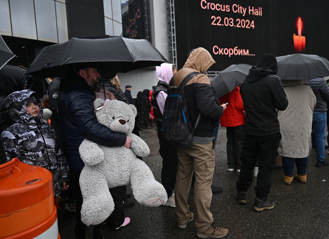 Largas colas de ciudadanos que portan flores y desean honrar la memoria de las víctimas se han formado frente a la sala de conciertos Crocus City Hall, incendiada en el atentado terrorista.