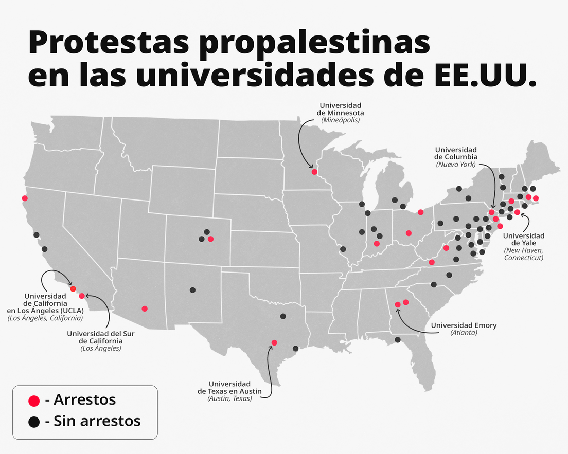 Universidades de EE.UU. siguen siendo centro de masivas protestas estudiantiles en apoyo a Palestina. Mientras la Policía interviene o planea intervenir en varios centros educativos para dispersar a los manifestantes e incuso se plantea la posibilidad de desplegar a la Guardia Nacional, el mapa de manifestaciones se expande.